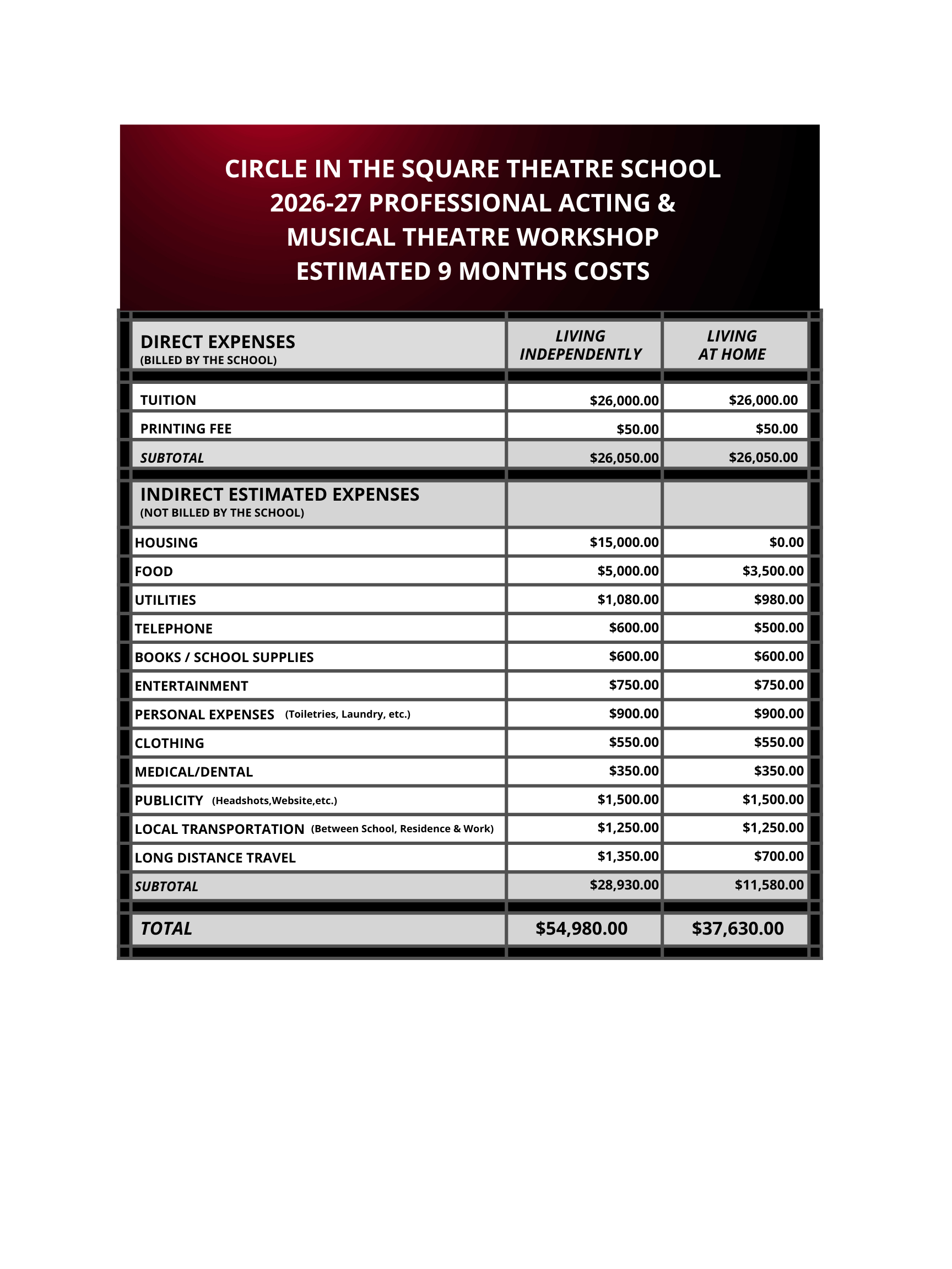 Cost of Attendance 2026-27 School Year