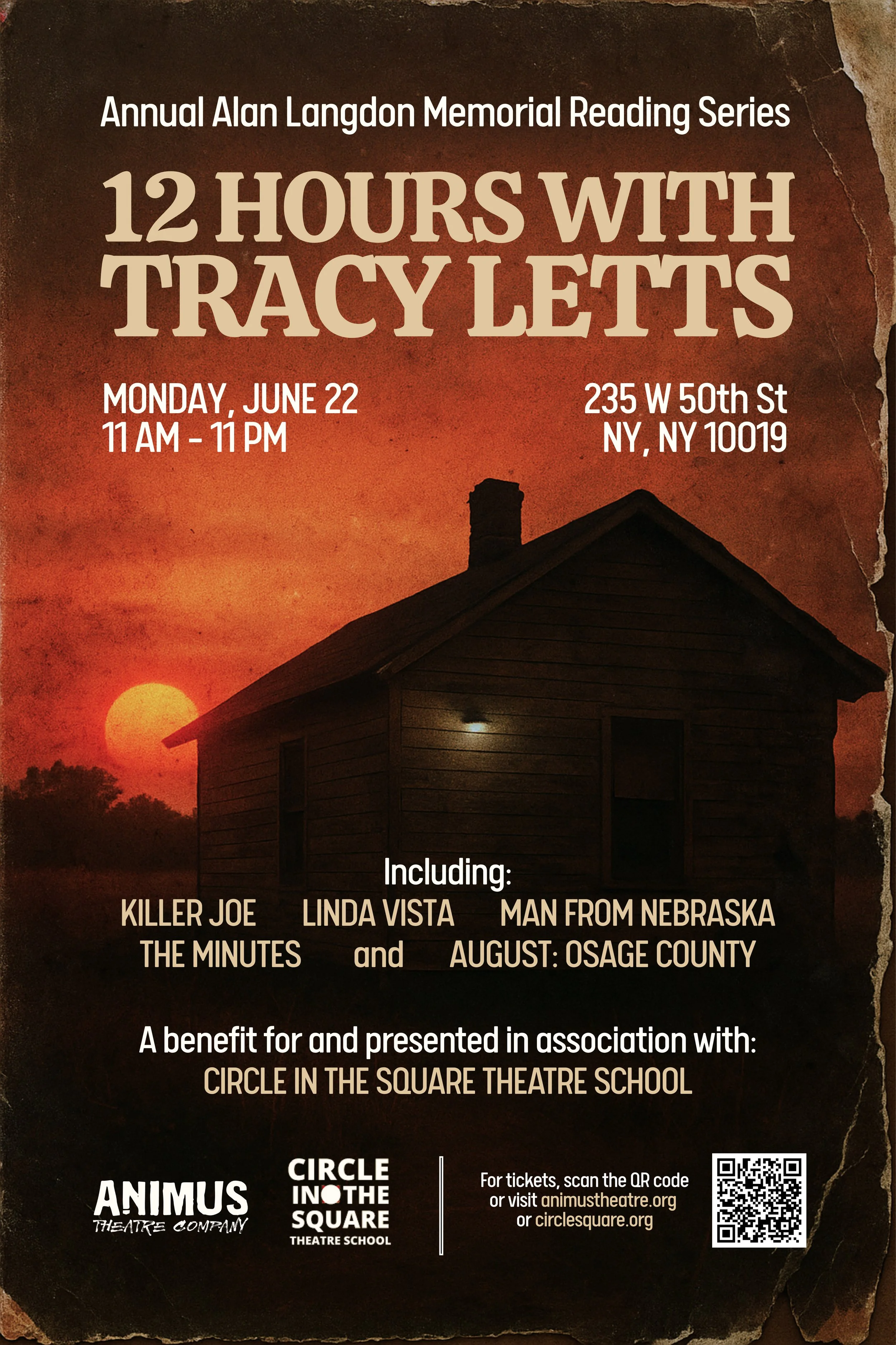 The Langdon 12-Hour Festival is intended to give audiences an opportunity to view multiple play readings connected via one writer in a marathon setting. The event is structured with the mission of being an affordable day of art for audiences and a benefit for Circle in the Square Theatre School, combining the linked works of one of the industry’s finest writers with many of its brightest stars of stage and screen, all read in a Broadway theatre.